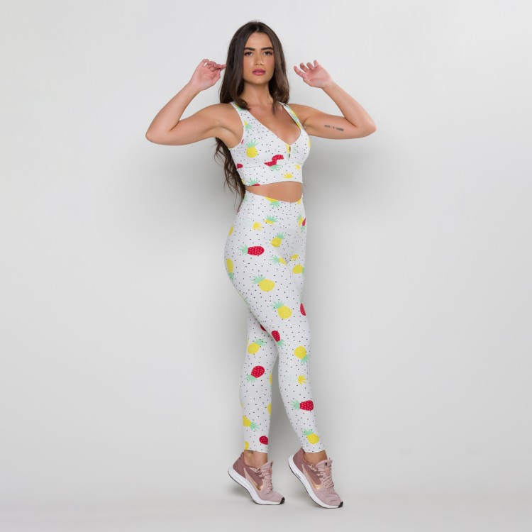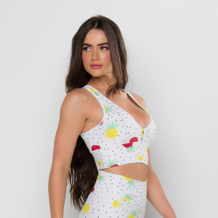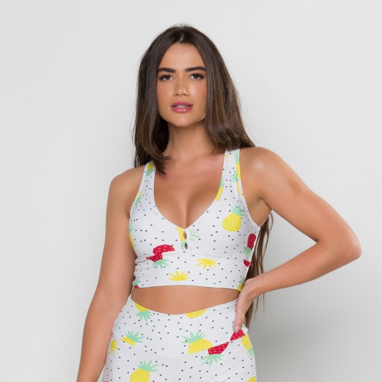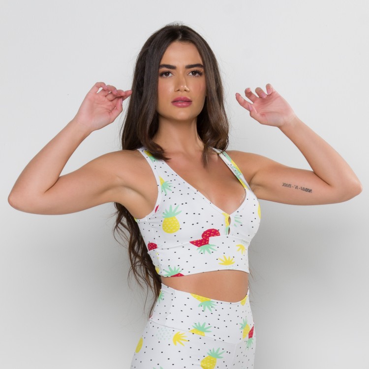 Top confeccionado em tecido suplex de poliamida, com toque geladinho e estampa digital. Promove sustentação, e maior conforto pelas alças largas e costas estilo nadador. Possui bojo removível.