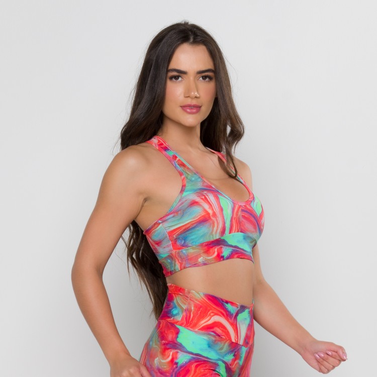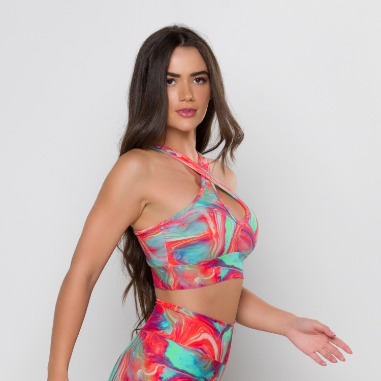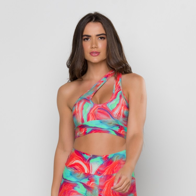 Top com toque geladinho, estampa digital e bojo removível. Pode ser usado de 3 maneiras: alças cruzadas para frente, para as costas, ou também com as alças para um ombro só. Tenha 3 modelos de top em apenas 1!