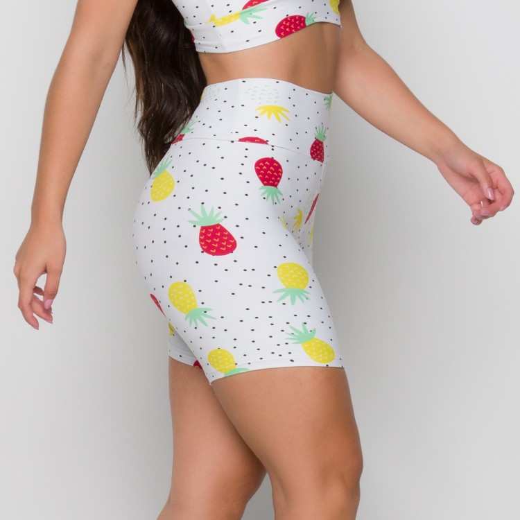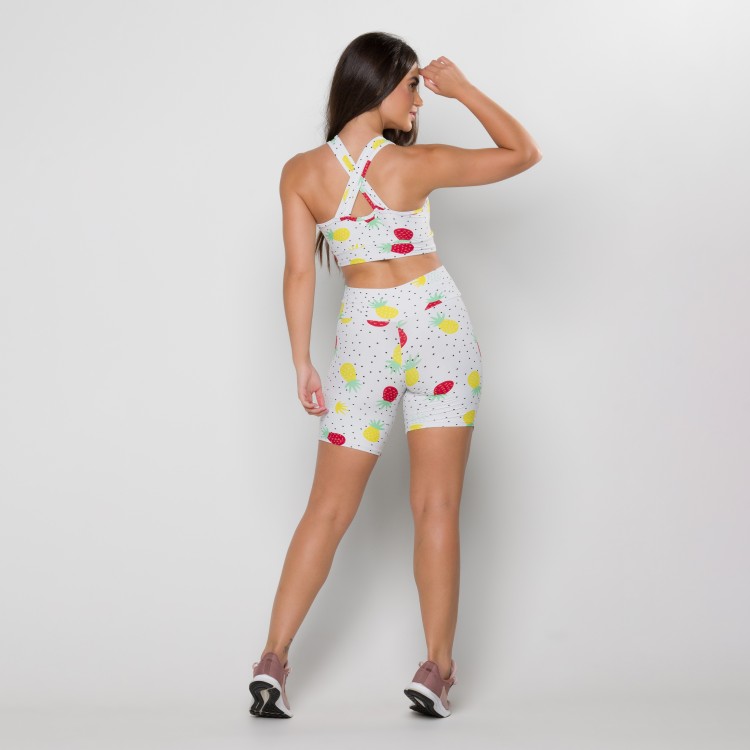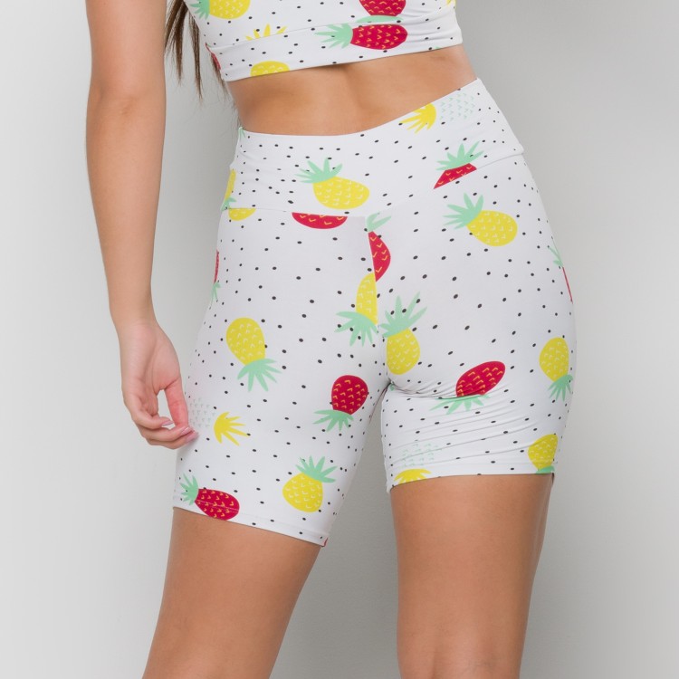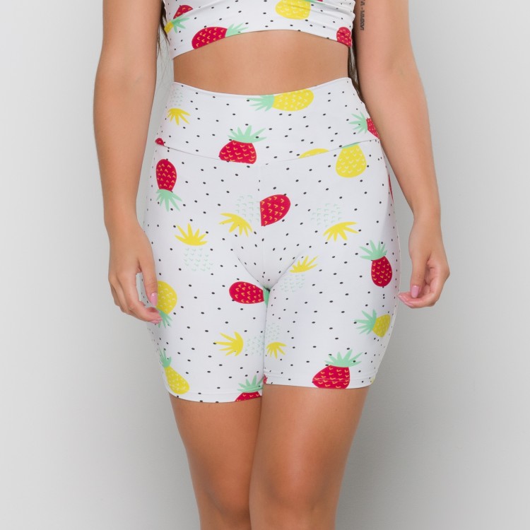 Short confeccionado em tecido suplex de poliamida, com toque geladinho e estampa digital. Cós alto, para mais conforto. Comprimento médio.
