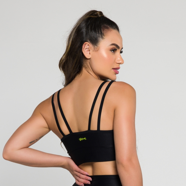 Top com modelagem perfeita, alça dupla e bojo removível. Lindo desenho das alças trançadas nas costas. Fabricado em tecido mini canelado, com leve brilho. Promove a sustentação e compressão na medida certa pra sua segurança e conforto.