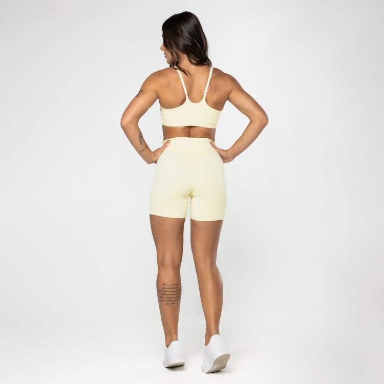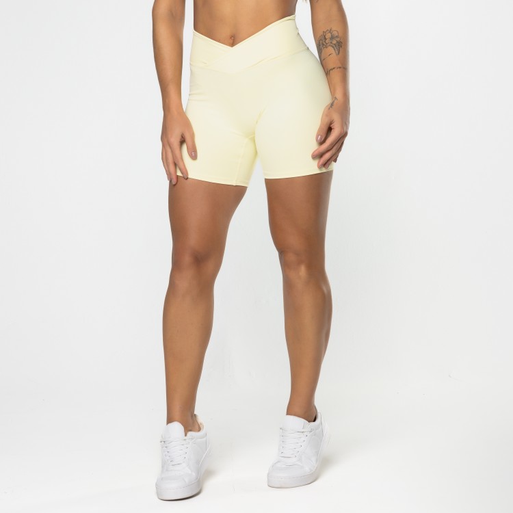 Short meia coxa desenvolvido em tecido premium de poliamida, com cós cruzado para afinar a cintura, sem