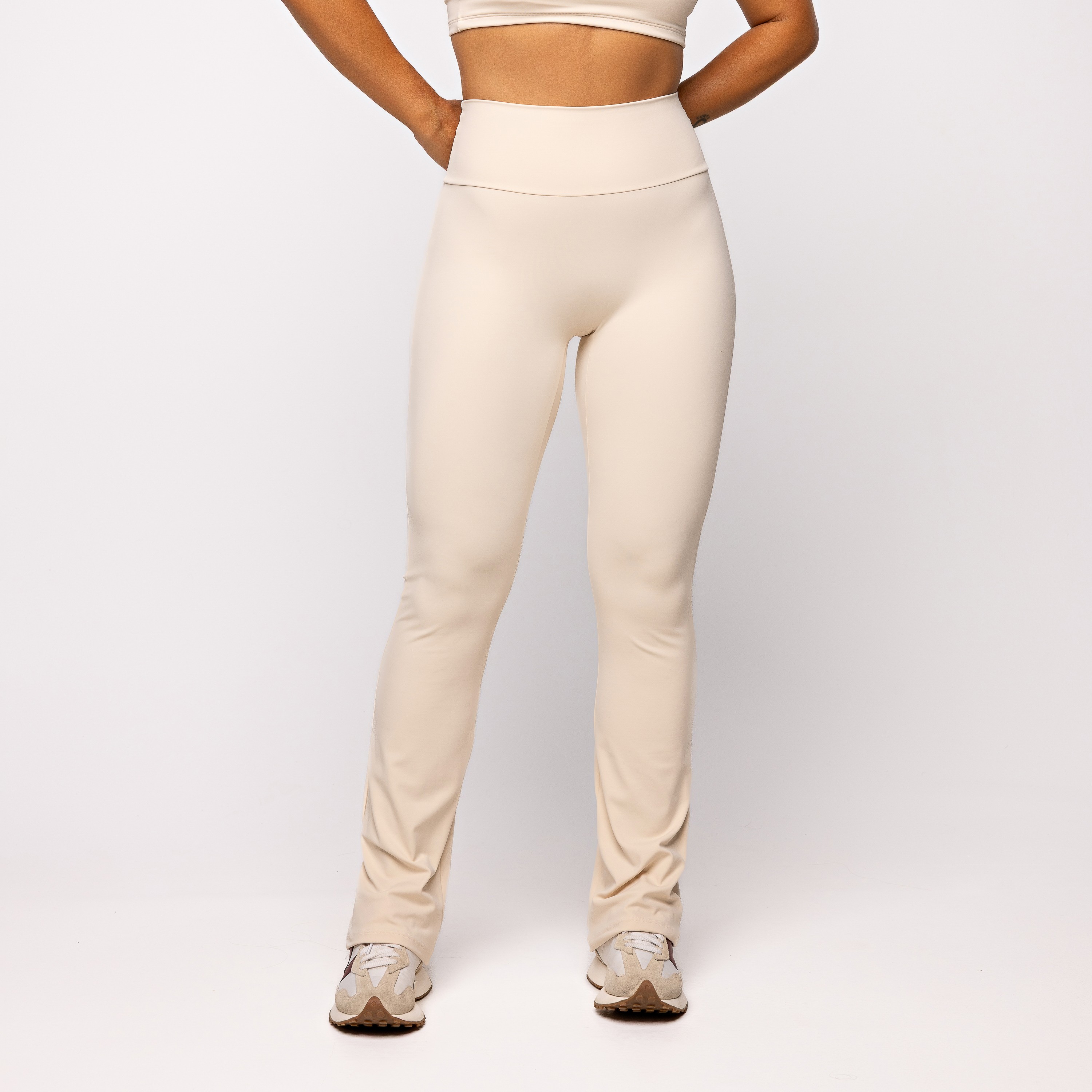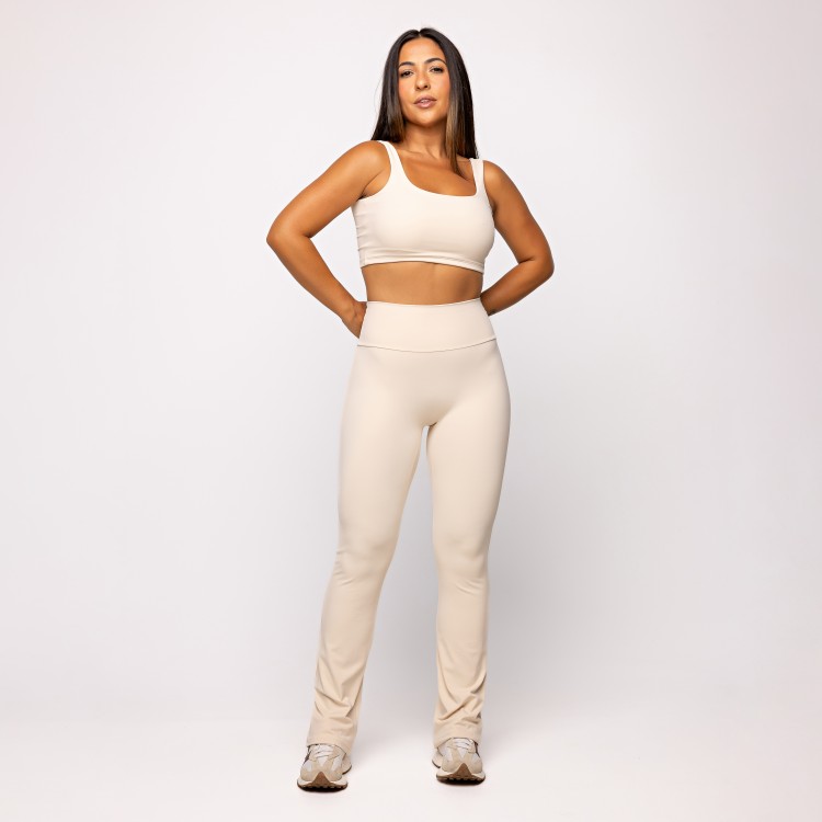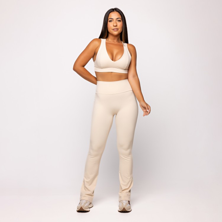 Tecido de poliamida com toque macio e elasticidade confortável. Modelagem flare que alonga visualmente a silhueta. Zero transparência. Indicada para treino leve, caminhadas, viagens e uso diário.